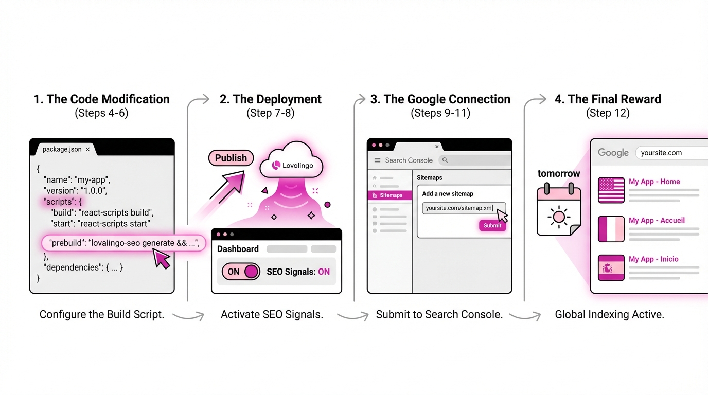 This guide, Part 2 of our SEO series, walks you through setting up Lovalingo's SEO features. Learn how to integrate SEO prompts, configure your sitemap, and submit it to Google Search Console for improved indexing.