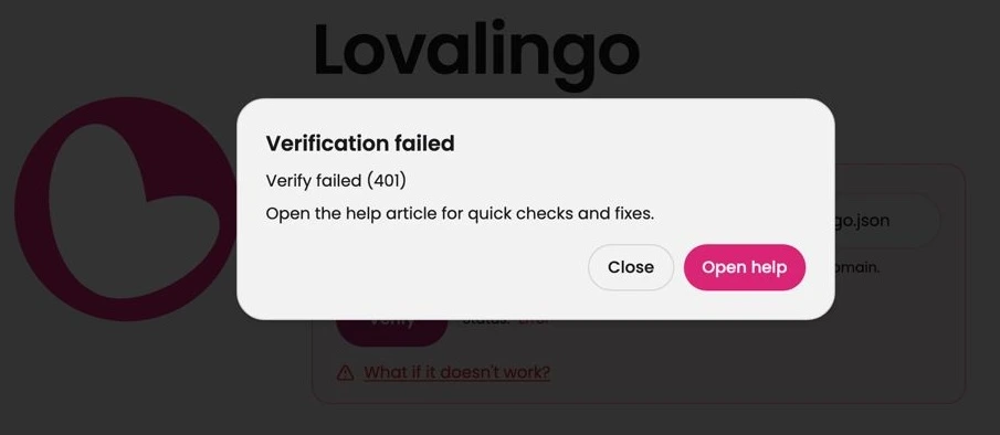 Encountering a 'Verification failed (401)' error during Lovalingo setup? This common issue is often a timing problem during deployment. Learn how to quickly resolve it by waiting and retrying, or by manually checking your manifest file.