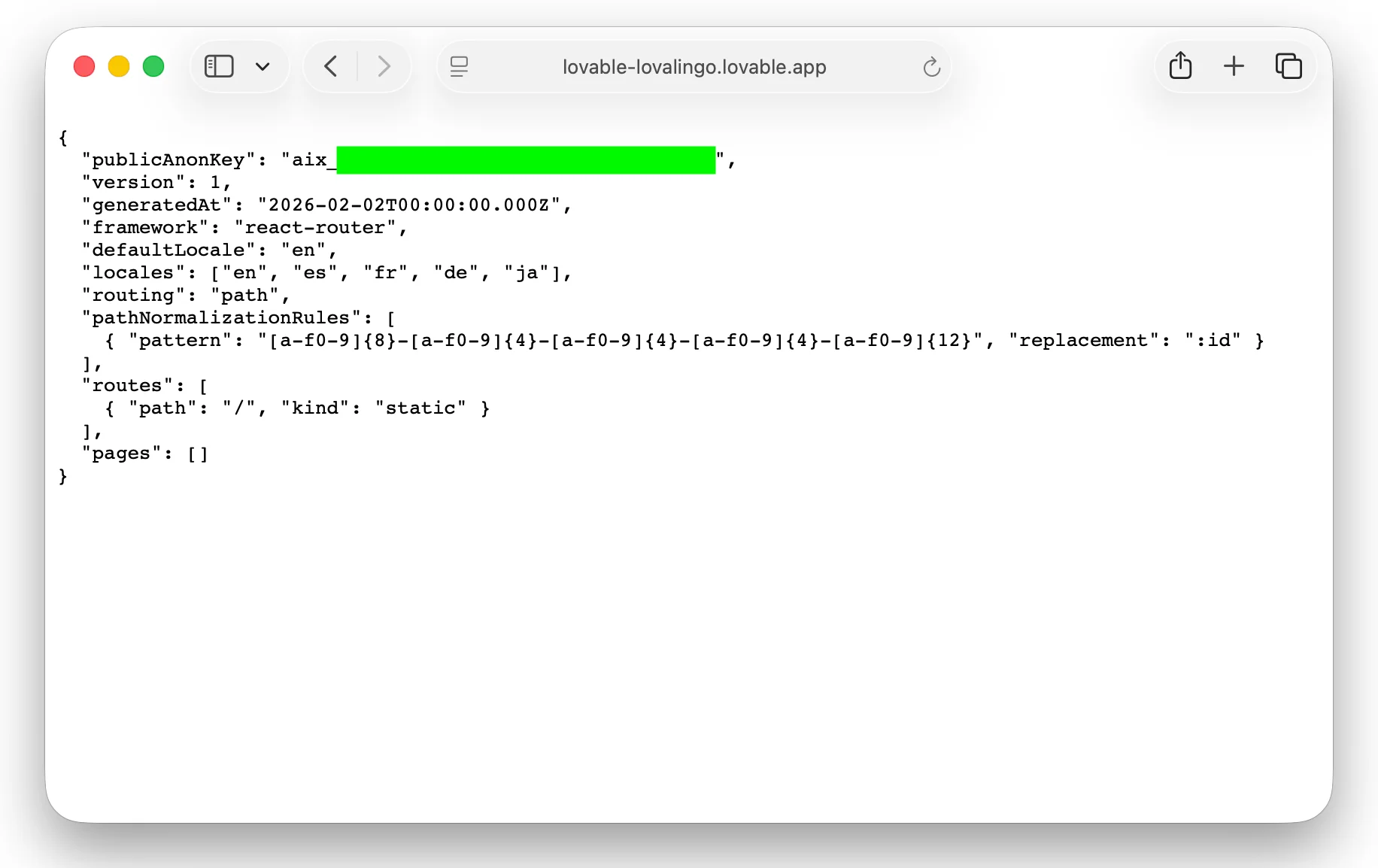 https://your-app.lovable.app/.well-known/lovalingo.jsonStep 3: You should see a JSON file like this: