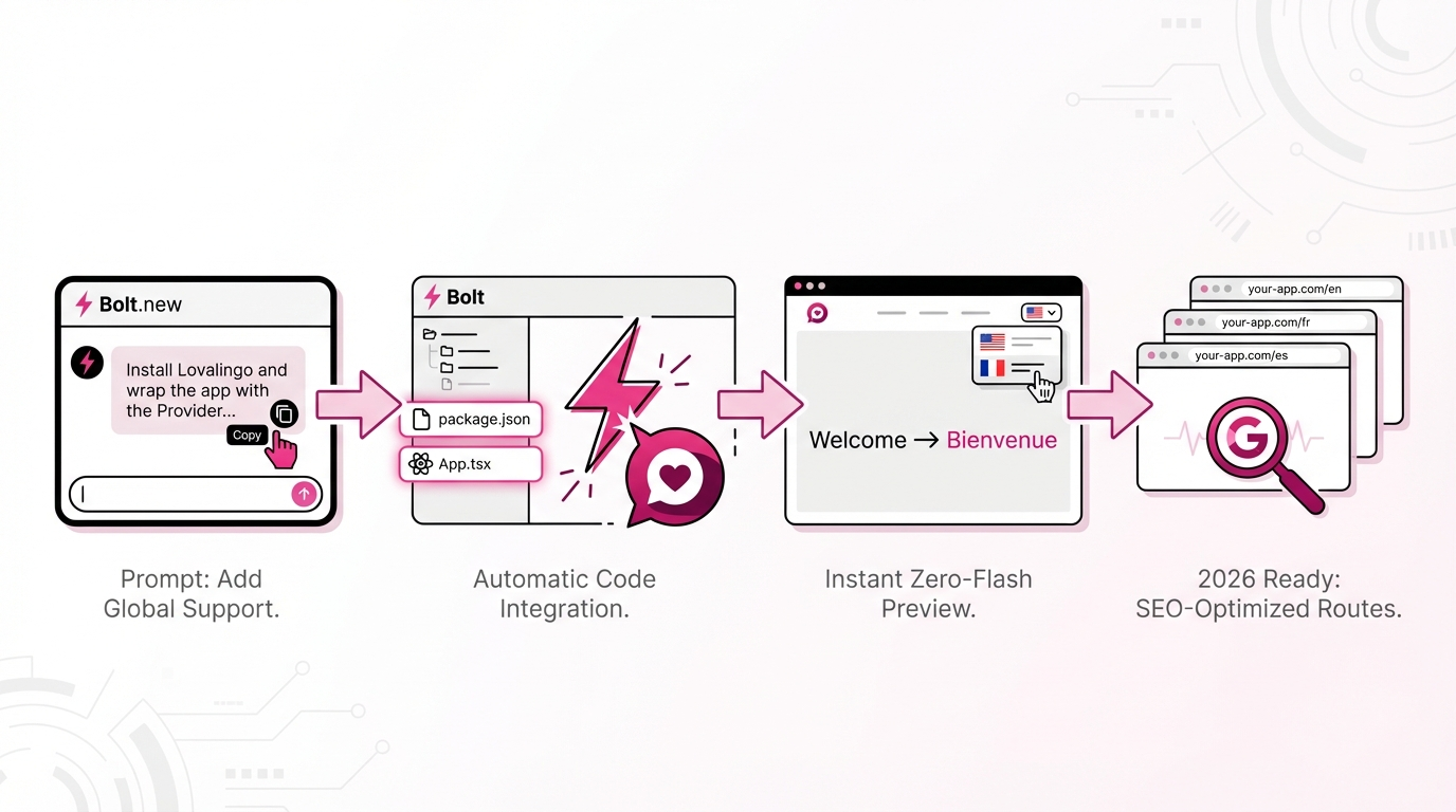 The best Bolt.new projects reach global audiences. Make yours multilingual in 5 minutes.